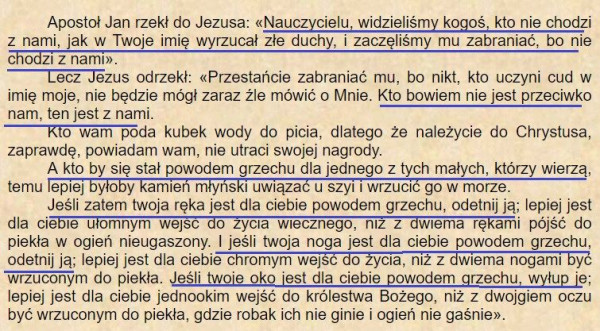 Komentatorzy rozbijają dzisiejszą Ewangelię na dwie odrębne perykopy: pierwsza (Mk 9,38-41) dotyczy kryteriów przynależności do wspólnoty uczniów Jezusa, druga zaś podnosi kwestię zgorszenia (9,42-43.45.47-48), które może być przyczyna upadku nie tylko „małych, którzy wierzą”, ...