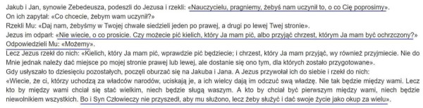 Nie tylko Jakub i Jan mają pragnienie zasiadania po prawicy i lewicy Chrystusa w Jego królestwie. Kiedy pozostali apostołowie usłyszeli, o co ci dwaj bracia proszą Jezusa, oburzyli się na nich, ujawniając tym samym własne ambicje władzy i dominacji. W odpowiedzi Jezus nie zakazuje im marze...