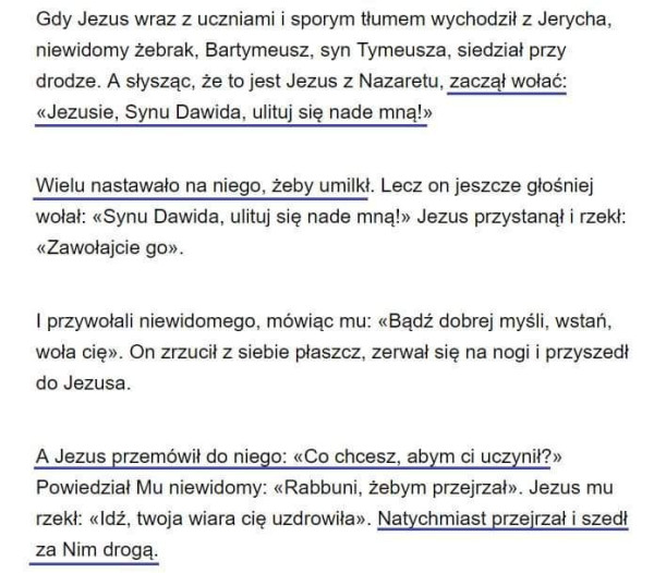 Słowa Ewangelii według Świętego Marka Gdy Jezus wybierał się w drogę, przybiegł pewien człowiek i upadłszy przed Nim na kolana, zaczął Go pytać: «Nauczycielu dobry, co mam czynić, aby osiągnąć życie wieczne?»Jezus mu rzekł: «Czemu nazywasz Mnie dobrym? Nikt nie jest dobry, ...
