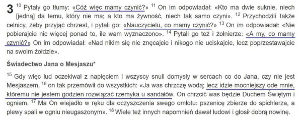 Można dzisiejszą Ewangelię czytać jako swoisty poradnik życiowy. Przychodzący nad Jordan ludzie pytają Jana Chrzciciela: „Cóż mamy czynić?” (Łk 3,10). Przychodzą do niego, bo ten nie tylko ich pociesza, uspokaja i rozumie, ale przede wszystkim pokazuje drogę ku prawdzie o nich ...